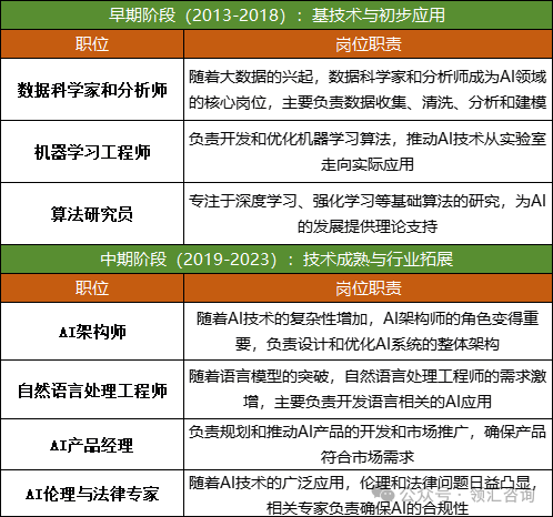 AI岗位的进化史直观的反映了技术从基础研究到深度应用的转变,同时也体现了跨领域融合和伦理规范的重要性且技术的转变速度也越来越快。未来,随着AI技术的进一步发展,岗位需求将更加多元化和专业化。