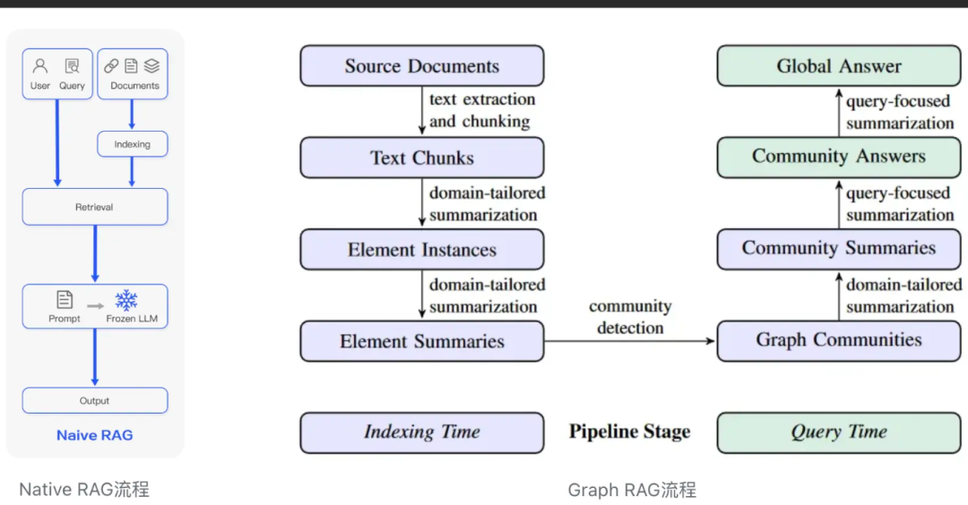 图Rag和上面的几种RAG架构的唯一区别就是其存储介质的不同,Graph Rag使用的是基于知识图谱的方式来组织和存储数据;这种方式在某些业务场景中具有更好的效果,比如说查询家庭成员关系,组织架构等。