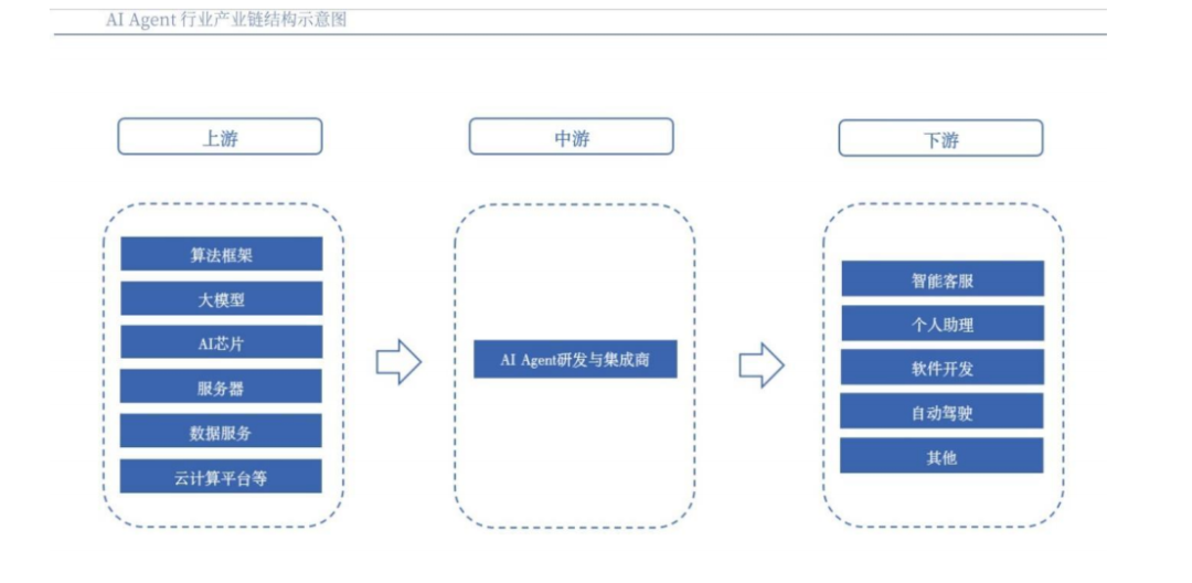 AI Agent产业链包括上游基础设施与技术提供商,中游AI Agent研发与集成商,下游应用厂商、终端用户等。