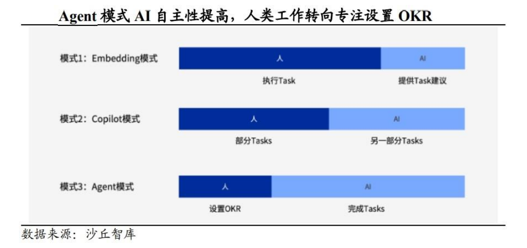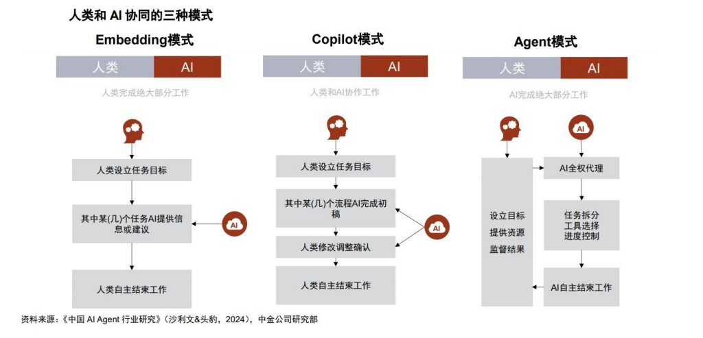 AI Agent能够代表用户或系统自主执行任务,通过设计工作流程并调用工具实现复杂功能。人机协作模式按照自动化程度不同,可以分为三种:Embedding、Copilot、Agent。