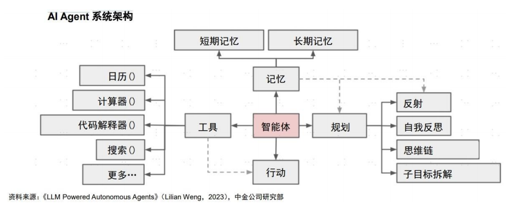 工作原理方面,AI Agent核心驱动力为大语言模型,规划、记忆和工具使用是其三个关键的组件,即AI Agent=LLM(大语言模型)+Planning(规划)+Memory(记忆)+Tools(工具)。具体来看,AI Agent通过传感器感知周围环境,使用LLM进行记忆检索、决策推理和行动规划等,结合外部工具获取信息等,最终或使用具体执行器做出响应。