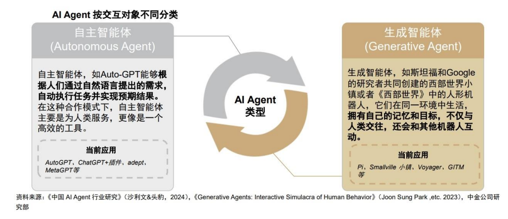 按交互对象不同,AI Agent可分为自主智能体(Autonomous Agent)和生成智能体(Generative Agent)。