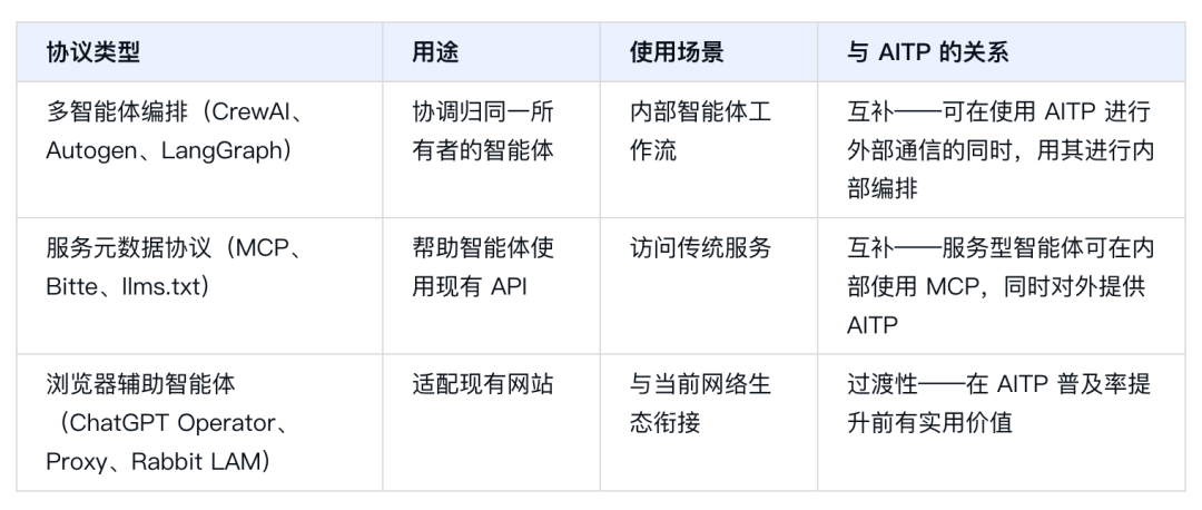 最上层是应用协议层,基于语义网技术实现智能体能力的描述与高效交互,解决“提供什么功能”和“如何被发现”的问题。智能体通过标准化的描述文档公布自己的功能清单和支持的接口,类似于交换电子名片。这使得智能体不仅能传输数据,还能理解数据的语义,实现更高级的协同决策。