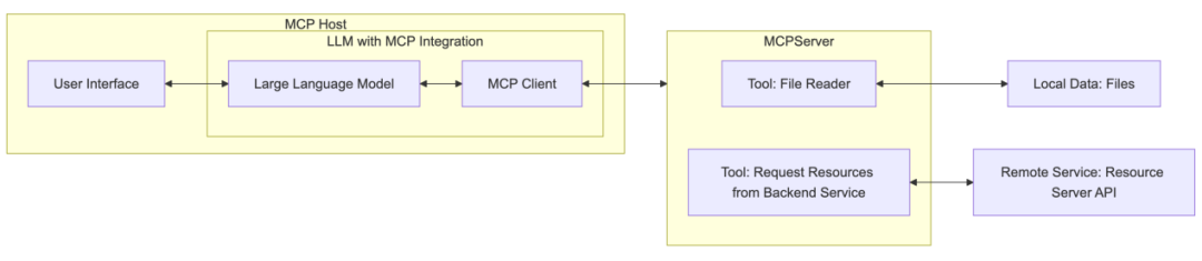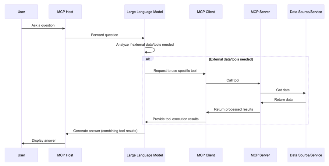 每个MCP服务器都提供了一组特定的工具,负责从本地数据或远程服务中检索信息。当LLM在处理任务时确定需要调用某个工具时,即可通过MCP服务器提供的工具获取必要数据并返回至大模型。