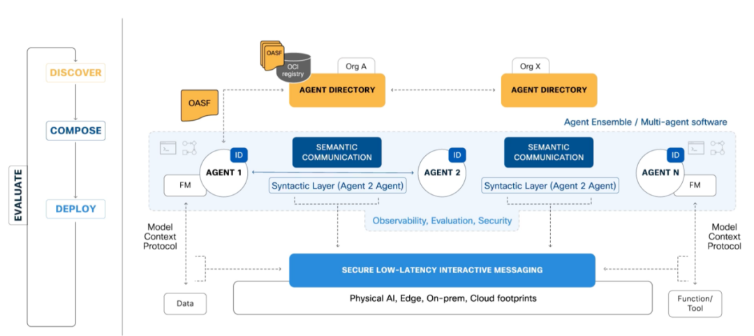- 开放智能体模式框架(OASF):基于OCI(开放容器倡议)的可扩展数据模型,用于描述智能体属性并确保其唯一标识。OASF支持描述A2A智能体、MCP服务器,还可扩展适配其他主流格式。