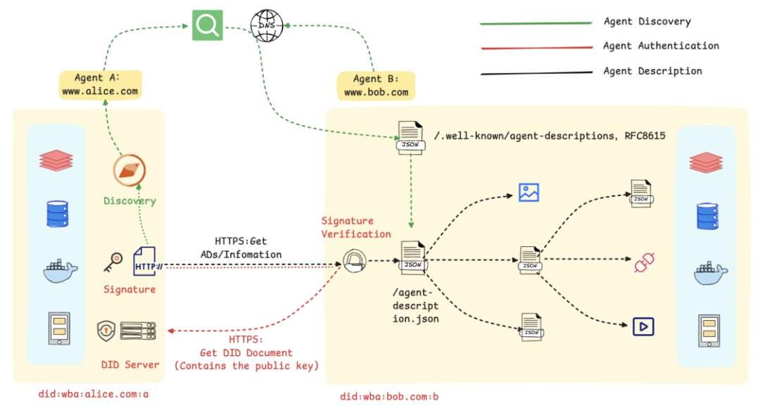- 智能体搜索:智能体A通过搜索引擎找到智能体B的描述文档URL。这一步使得智能体能够在不知道对方具体域名的情况下,通过语义搜索找到合适的服务提供者。
