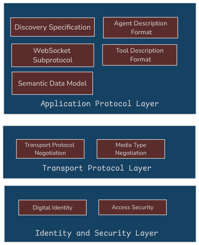 ANP采用三层架构设计,确保了智能体能够在互联网上自主寻找彼此,安全建立连接,并有效交流。