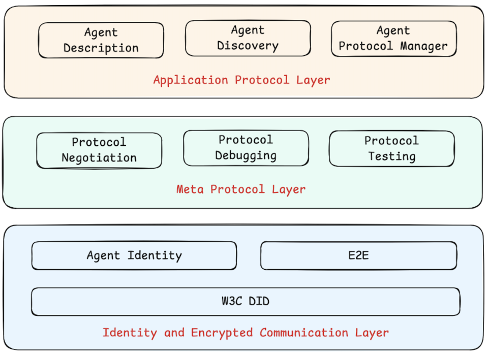 中间层是元协议层,负责智能体间动态协商具体的通信协议,解决“如何协商通信方式”的问题。当两个智能体建立连接后,会通过元协议商量使用什么语言和格式交流,使网络具备自适应、自协商的能力。