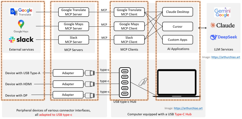 过去,电脑需要多种硬件接口(如USB、HDMI等)连接不同设备,直到USB-C出现,凭借统一标准解决了设备互联的复杂性。MCP就像是AI世界的USB-C接口,为AI系统与外部工具搭建了标准化的数字桥梁,使大模型能够通过统一规范与数据库、API等动态交互。