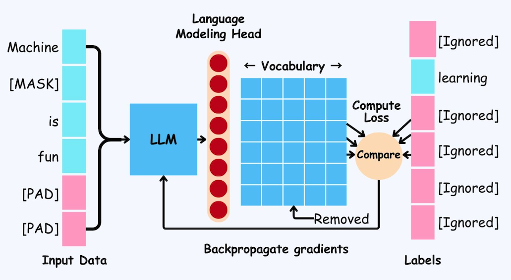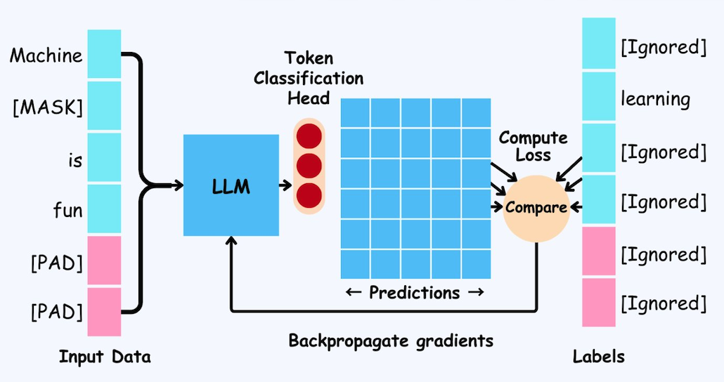 - 工作原理: 在句子中随机“遮蔽”一些词语(用