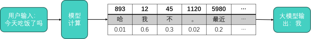 概率计算:模型通过内部参数计算,为下一个可能出现的 token 赋予概率值(如 “我”=0.6、“不”=0.3)。