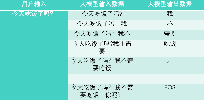 如果每次取概率最高的token,重复上述步骤,逐 token 生成文本,直到出现结束标志(EOS),形成完整回复。