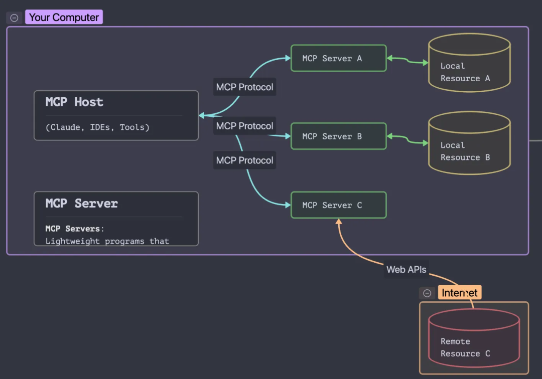 | Remote Services | MCP 服务器可以连接到的 Internet 上可用的外部系统(例如,通过 API) |