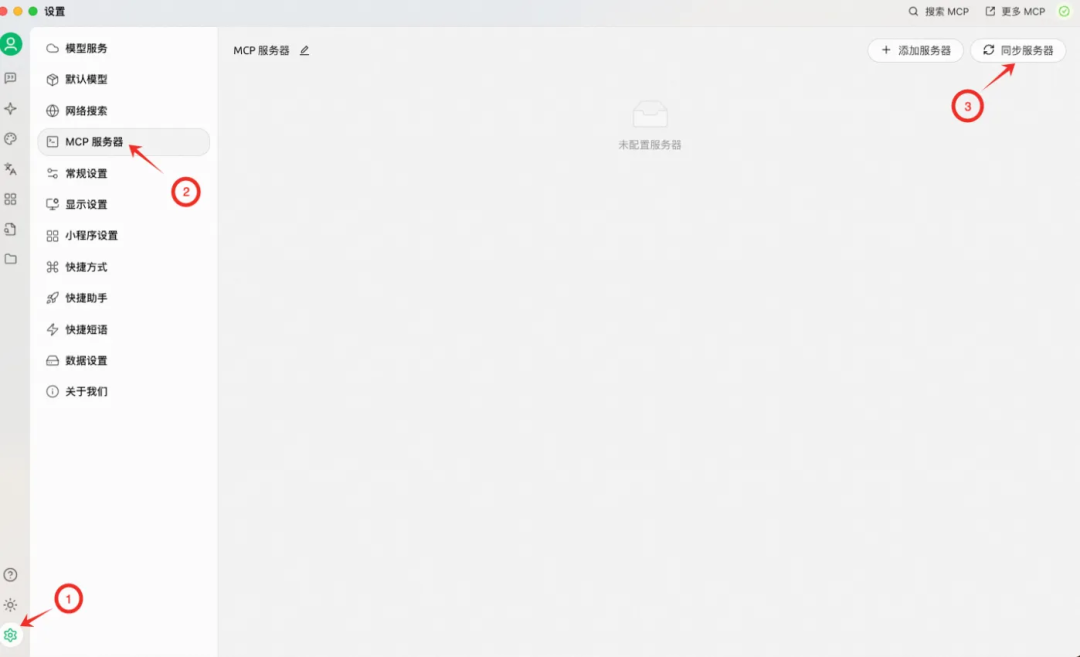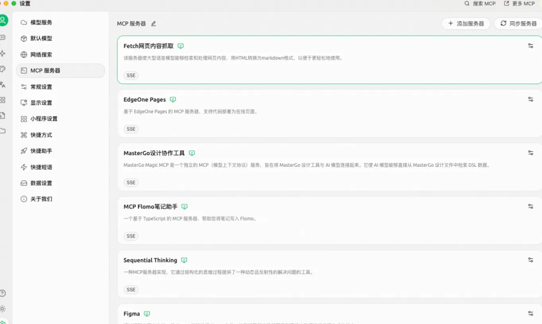 在Cherry Studio启用MCP服务需要在「设置」中添加可用的MCP服务配置。可以前往“设置-MCP服务器-同步服务器”快速同步ModelScope MCP服务。