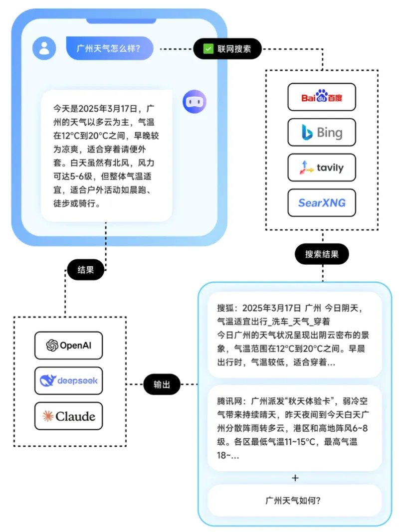 常见的 AI 助手采用通过联网搜索获取实时信息。当用户开启联网搜索时,助手先将用户的请求发送至搜索引擎,再将返回内容与用户输入一起提供给大模型,最终生成回答。搜索引擎在此作为实时信息源,为大语言模型提供额外的上下文。