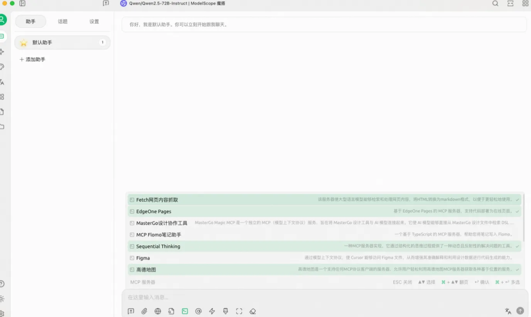 可以看到所有已经配置连接的魔搭Hosted MCP服务,都已经同步在Cherry Studio可用MCP服务器列表中。