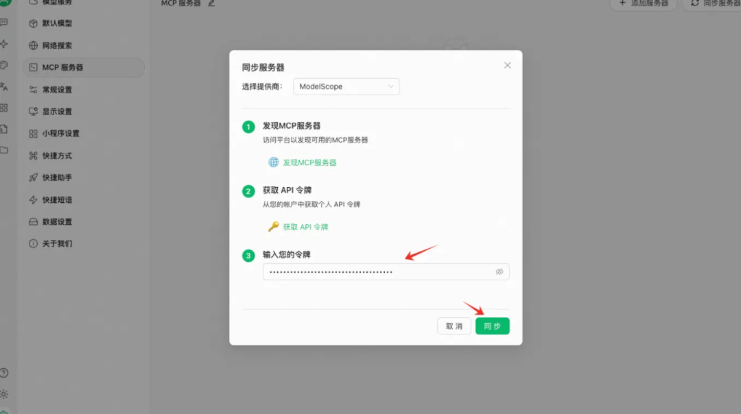 在获取ModelScope API令牌后,粘贴到步骤3的空格中,并点击「同步」按钮。