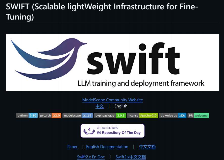 ms-swift(Scalable lightWeight Infrastructure for Fine-Tuning)是由魔搭社区(ModelScope)开发的高效微调和部署框架,旨在为研究人员和开发者提供一站式的大模型与多模态大模型的训练、推理、评测、量化和部署解决方案。