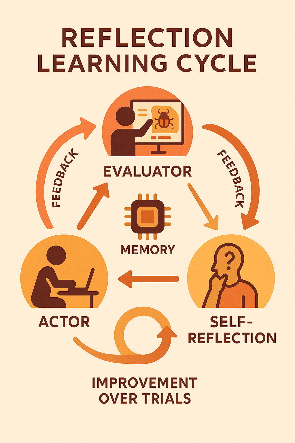 关键创新在于这些组件如何跨试验交互。当智能体在任务中失败时,它不只是用相同方法重启。它明确反思哪里出错了,生成可行的反馈,并在后续尝试中使用这个洞察。这创造了一个学习循环,无需梯度下降或模型微调[21]。
