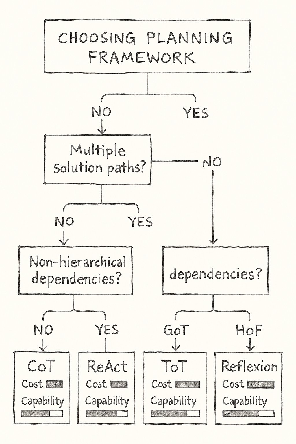 正确的规划方法取决于问题的特征。简单的确定性任务通常只需要直接提示或思维链。复杂规划的计算开销会浪费资源。