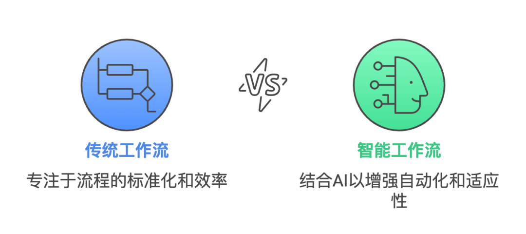 智能工作流概念是在传统工作流基础上融合了 AI 的能力。它依然是一套预定义的流程“蓝图”,但在流程的某些步骤上,引入了大模型或者 Agent 来完成原本需要人才能处理的复杂决策或创作工作,从而达到更高的自动化水平和灵活性。可以把智能工作流看作是架构师,而 AI Agent 是施工中灵活应变的工人,两者配合能够打造出既有秩序又有智能的系统。