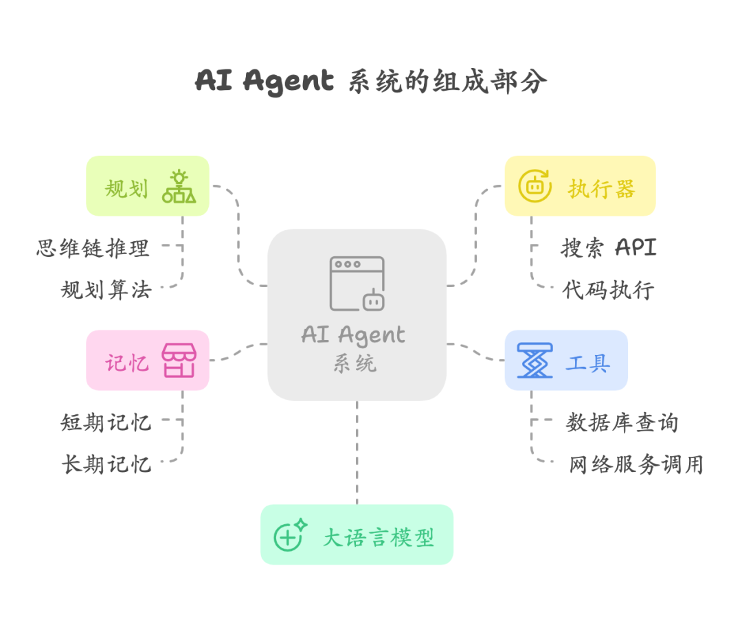 那么,一个典型的 AI Agent 系统由哪些部分组成呢?首先核心依然是大语言模型本身,它是 Agent 的大脑,负责理解任务、分析问题并决定行动策略。除此之外,通常还需要几个关键模块来配合 :