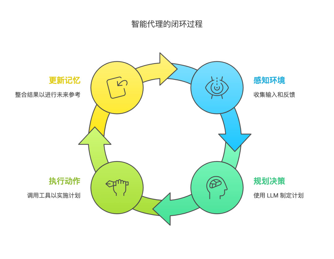通过以上组件的分工协作,Agent 实现了一个闭环:感知-思考-行动-再感知。它感知环境(通过读取输入和工具反馈)、思考决策(由 LLM 规划)、付诸行动(调用工具执行),再将行动结果纳入记忆,继续下一步。如此循环,直到达到目标或无法继续。这个过程与我们人类解决问题的方式非常相似。
