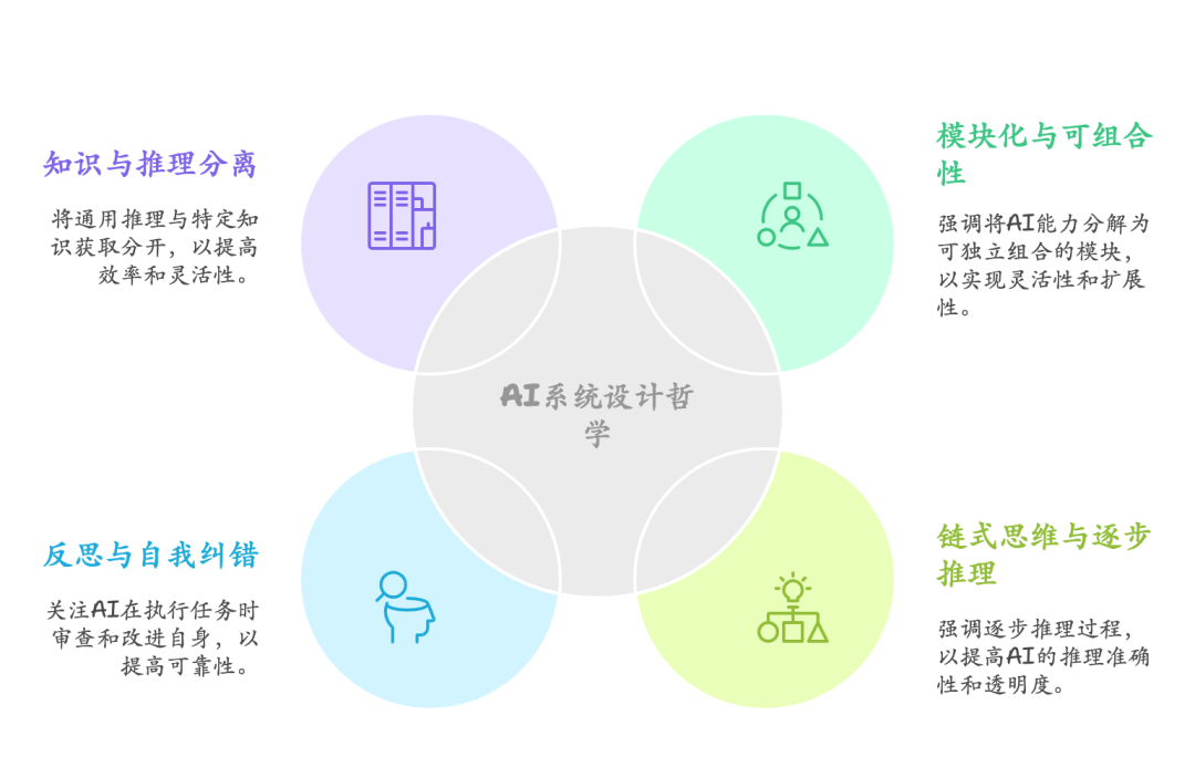 最后一个统一的逻辑是知识与推理相分离的思想。传统上,我们构建一个智能系统往往把知识库和推理程序混在一起。但大模型时代,我们倾向于让一个通用模型掌握推理和语言能力,再通过检索或工具调用去获取具体知识。这种架构实际上遵循了计算机科学里的分而治之和职责分离原则:模型负责通用推理,知识库负责存储信息,工具负责与环境交互,各尽其职。这不仅提高了效率(因为不用为每个新知识再训练模型),也使系统更加灵活(知识更新只需更新数据库,不用重训模型)。从 RAG 到 Agent 再到 Workflow,都体现了这种组合逻辑——将不同能力来源的模块组合起来完成比单一模块更复杂的任务。