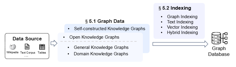 图数据库的构建和索引是 GraphRAG 的基础,图数据库的质量直接影响 GraphRAG 的性能。主要针对图数据的选取以及所采用的索引方法进行分类总结。