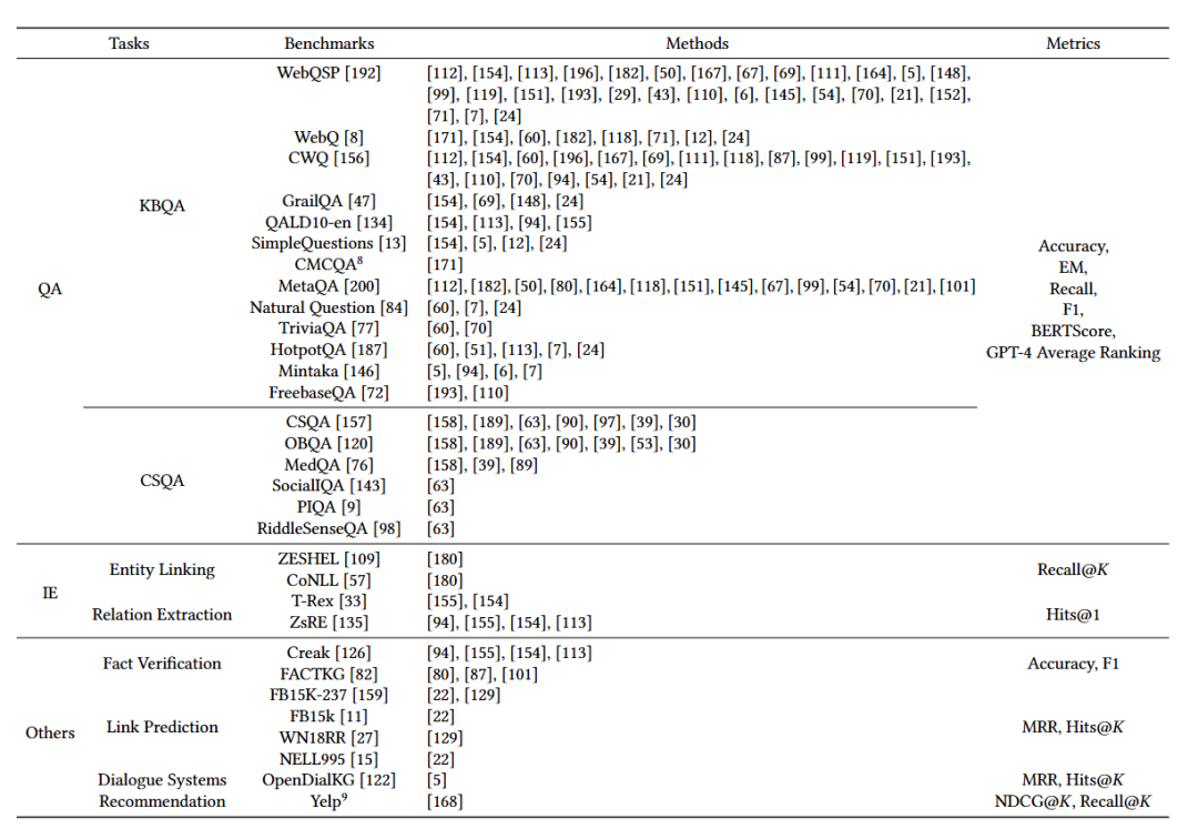 QA 任务特别包括知识库问答(KBQA)和常识问答(CSQA)。KBQA 和CSQA是 GraphRAG 的关键下游任务。在 KBQA 中,问题通常涉及特定的知识图谱,答案通常涉及实体、关系或实体集合之间的关系和操作。CSQA中常识推理通常会将一个常识问题与几个答案选项一起呈现,找到与问题和选项相关的知识,并进行适当的推理。