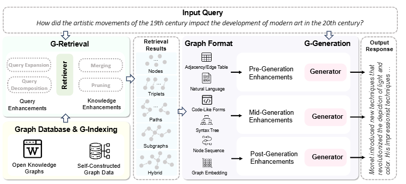 3.图增强生成(G-Generation):图增强生成阶段涉及根据检索到的图数据合成有意义的输出或响应。这可能包括回答用户查询、生成报告等