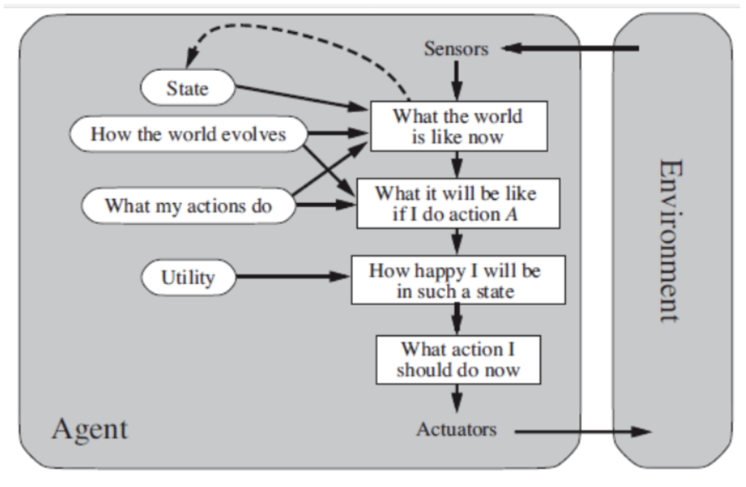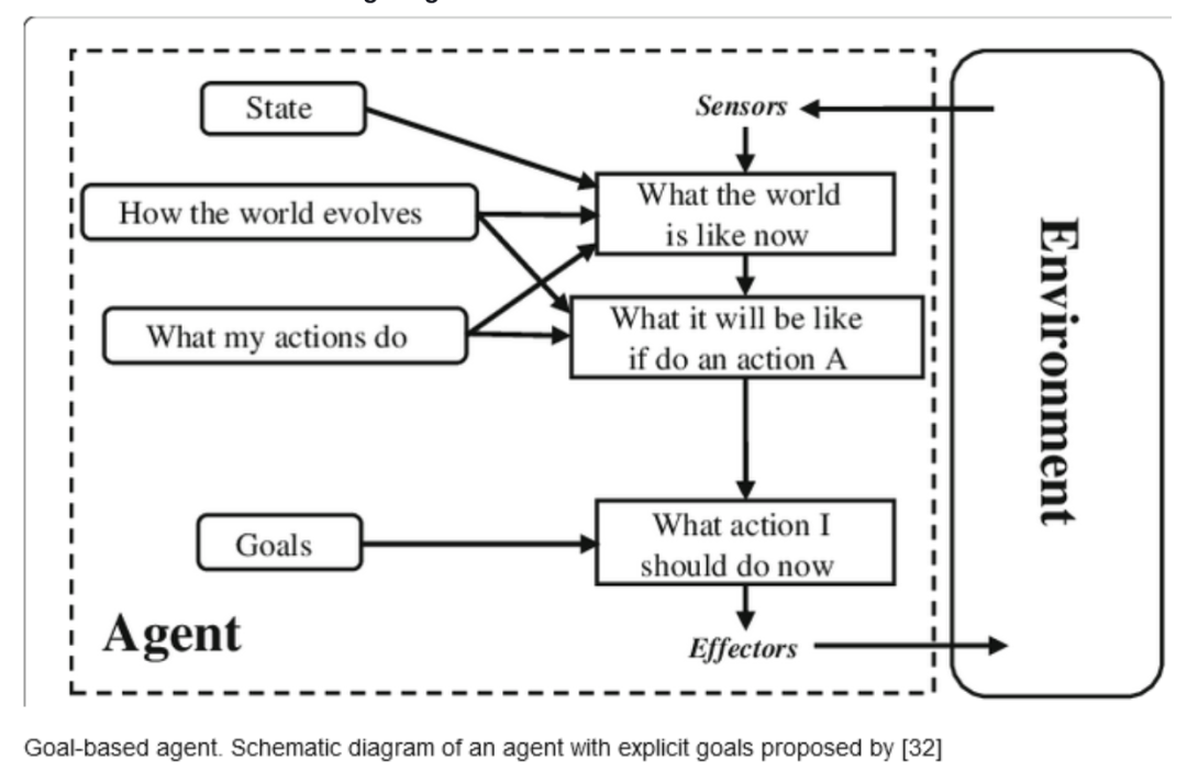 上图展示了一个基于目标的智能体,它感知环境、评估其状态、跟踪世界的变化,并评估行动的效果以预测未来结果。它依赖于特定的目标来决定采取何种行动,并使用效应器实施这些决策以实现其目标。