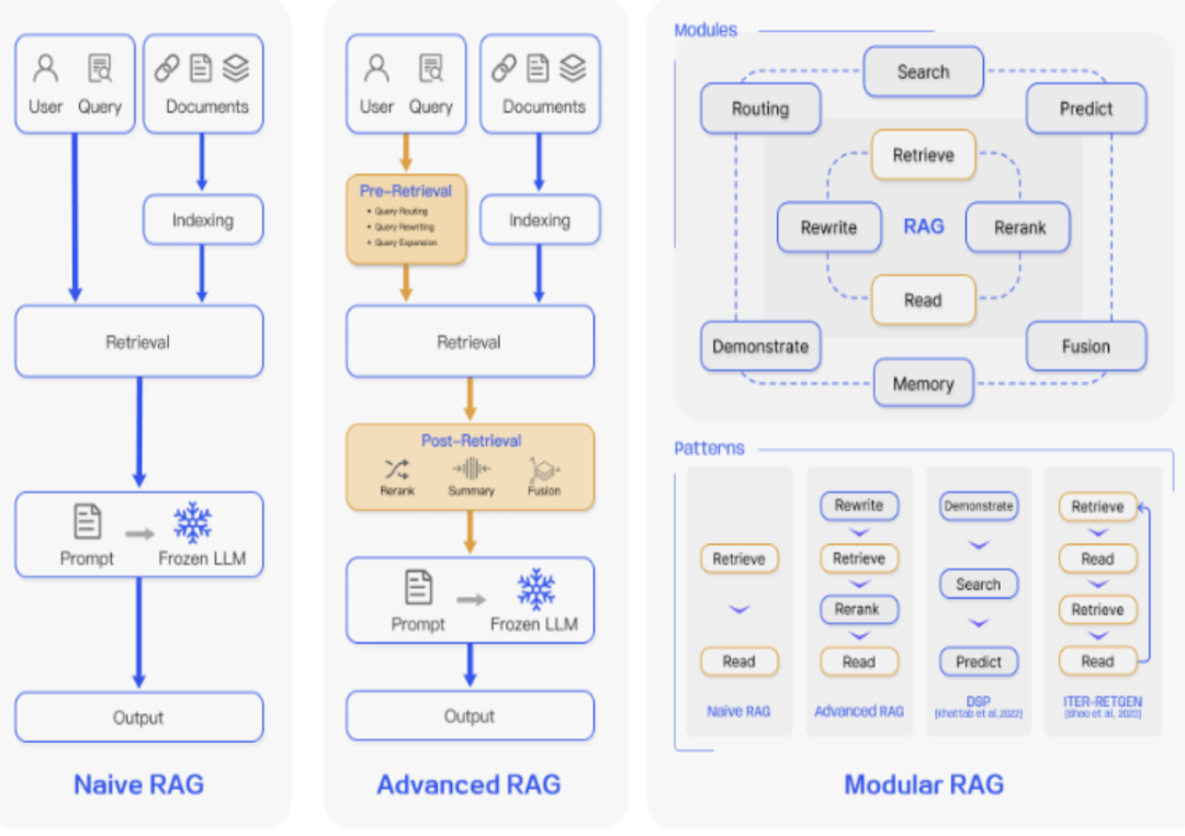 RAG 研究模型不断演进,目前可以大致分为三个不同的阶段:朴素 RAG(Naive RAG)、高级 RAG(Advanced RAG)和模块化 RAG(Modular RAG),具体如下图所示: