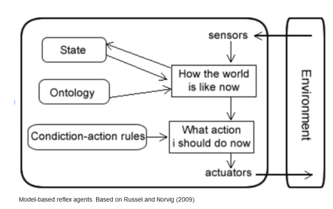 该图展示了一个基于模型的反射智能体,它使用传感器感知环境。它保持一个内部状态和本体来理解当前的情况。智能体使用条件 - 行动规则来决定采取何种行动,并通过执行器执行这些行动,从而在反馈循环中与环境进行交互。