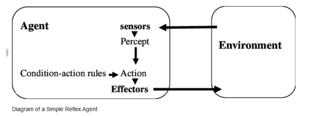 上图展示了一个简单反射智能体,它通过传感器与环境进行交互以收集输入,并使用效应器根据既定的条件 - 行动规则执行行动。环境提供反馈,形成一个持续的交互循环。
