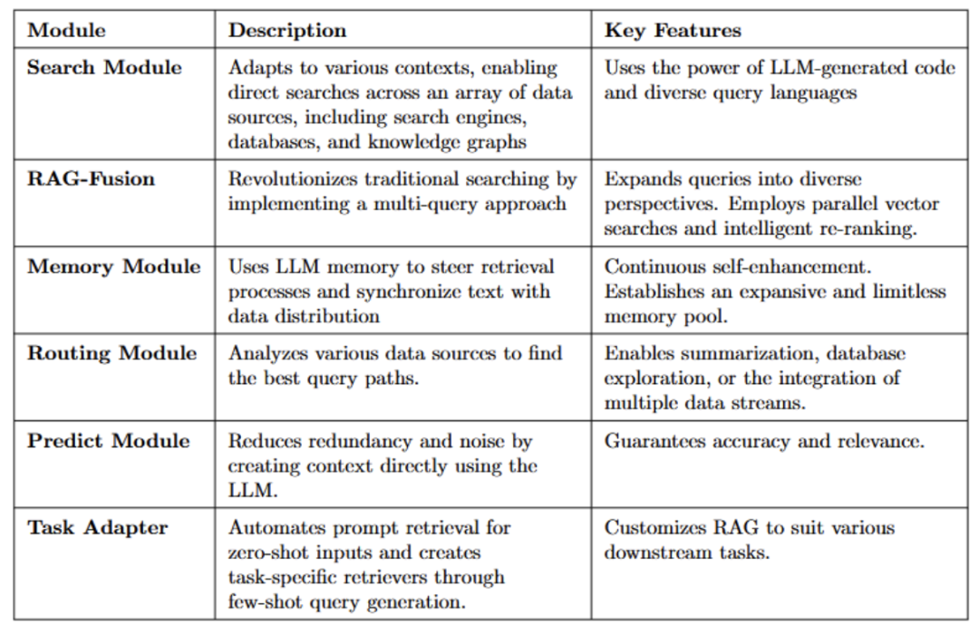 模块化 RAG 框架提供了专门的组件来提高检索和处理能力,具体如下表所示: