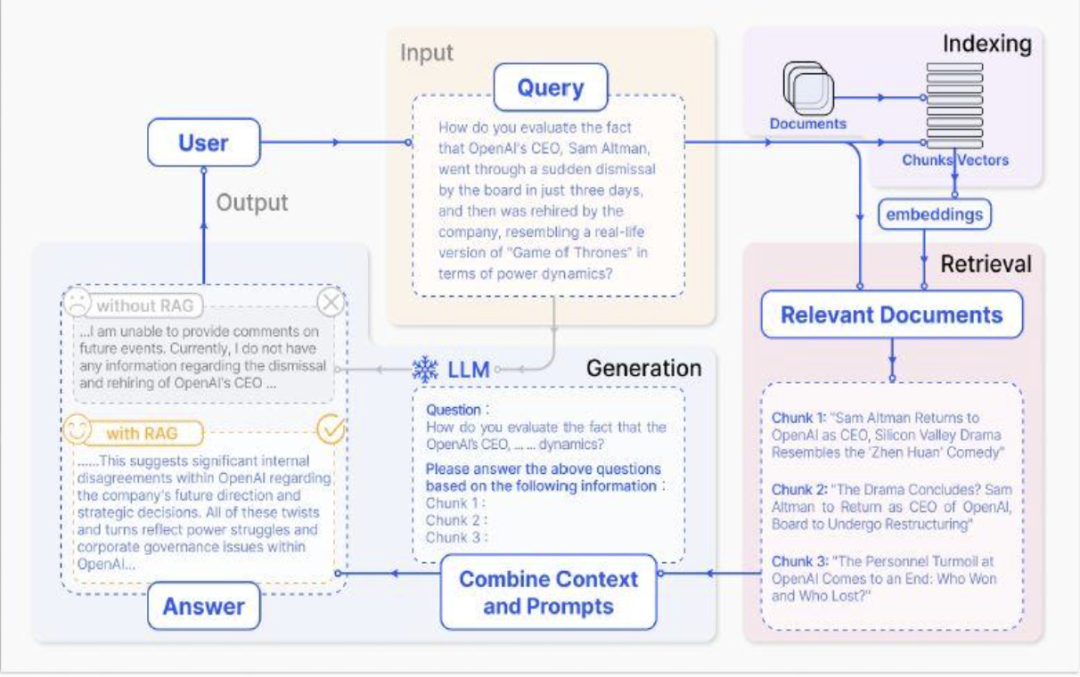 这个增强后的提示能够让语言模型将检索到的知识融入到输出中,从而生成知识丰富且准确的回答。因此,RAG 显著提高了模型提供精确、及时信息的能力,在那些需要实时更新信息的领域,如新闻、科学进展或金融市场,发挥着巨大的作用。