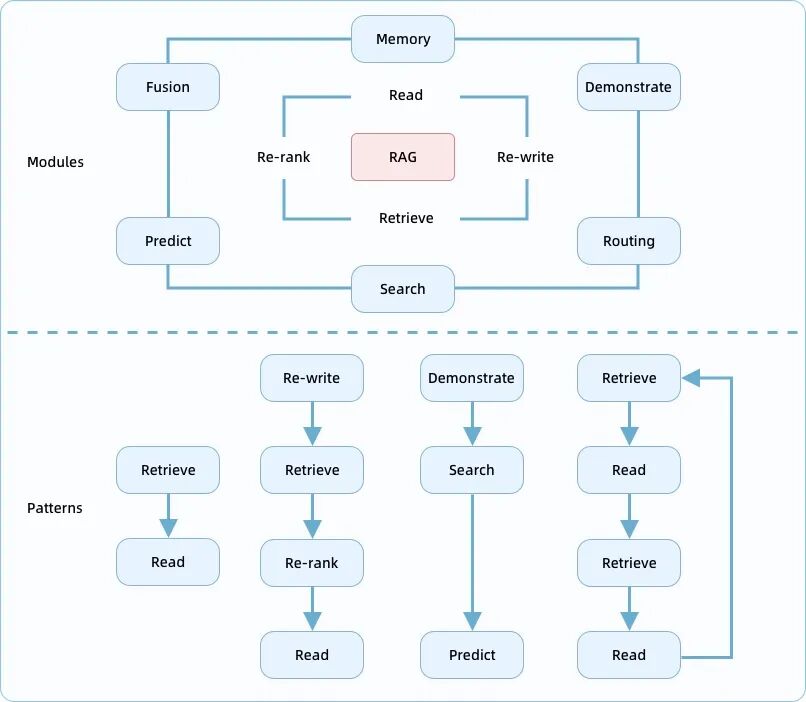 模块化RAG将检索和生成管道细分为多个独立的模块,这种模块化设计允许根据不同需求进行灵活配置和优化。它结合了稀疏检索(如传统的关键词匹配)和密集检索(如基于向量的语义检索)方法,根据查询类型的不同,灵活选择最合适的检索方式,以提高检索效率和准确性。同时,它支持与外部API、数据库等多种工具进行集成,拓展了数据来源和处理能力,适用于复杂多领域的任务,如金融分析、法律研究等。