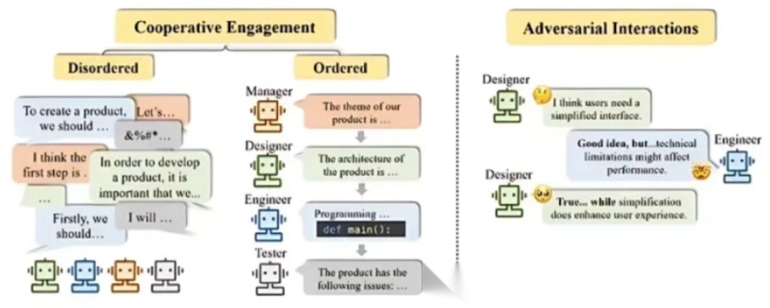图:基于 LLM 的多个代理的交互场景。在合作互动中,代理以无序或有序的方式进行协作,以实现共同目标。在对抗式交互中,代理以针锋相对的方式展开竞争,以提高各自的性能。