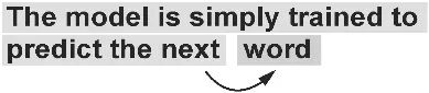 图 1-7 在 GPT 模型的下一单词预测预训练任务中,系统通过观察之前的词来学习预测句子中的下一个词。这种方法能够帮助模型理解词语和短语在语言中的常见组合,从而为应用于各种其他任务奠定基础