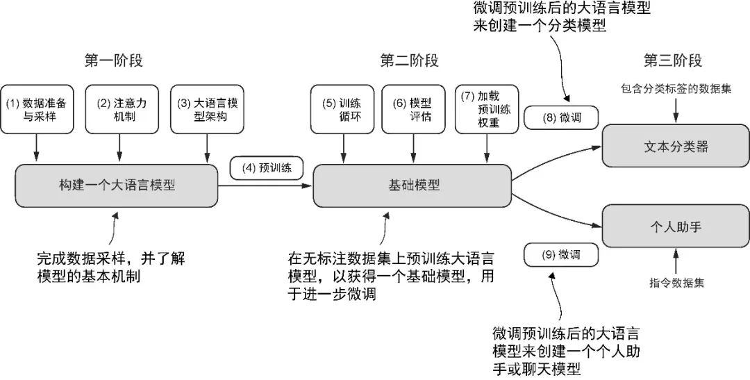 本文我们为理解大语言模型打下了基础。我们将以 GPT 的核心原理为指导,从零开始,一步步构建自己的模型。按照图 1-9 所示的路线图,分 3 个阶段来逐步实现这一目标。