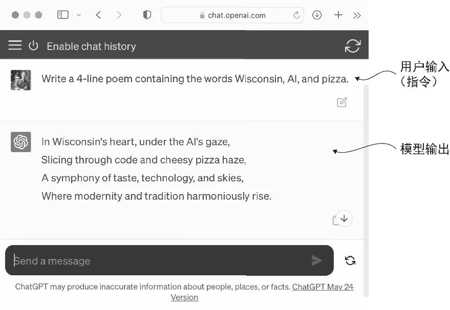 图 1-2 大语言模型界面实现了用户和人工智能系统之间的自然语言交互。该截图展示了 ChatGPT 按照用户要求创作的一首诗