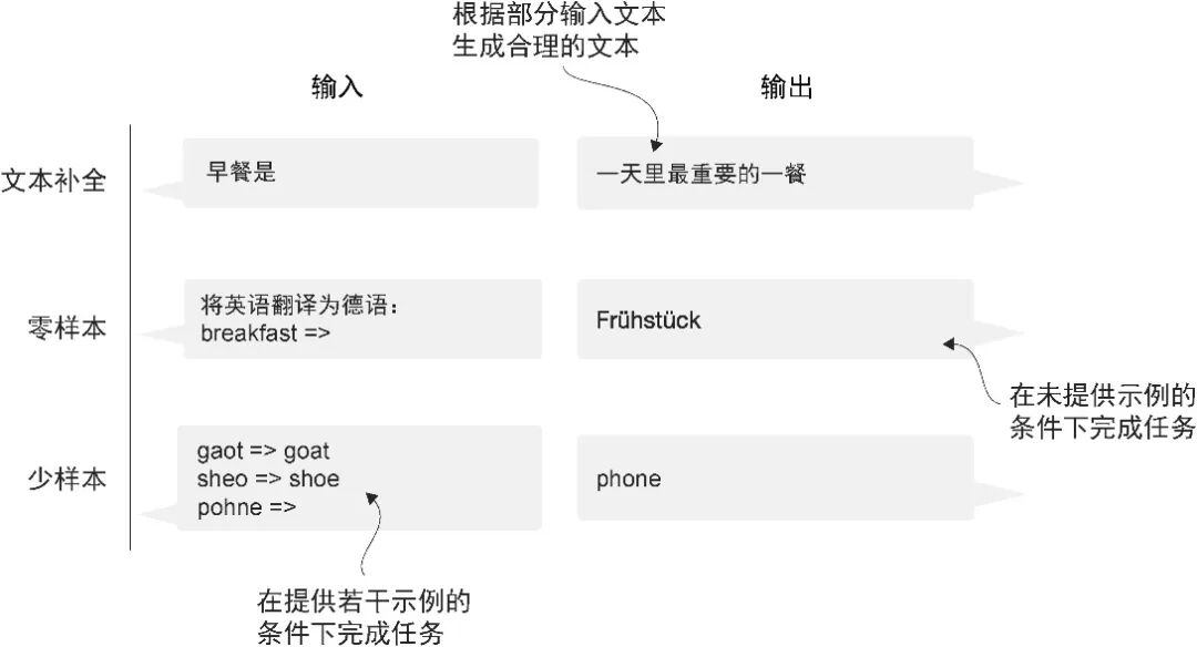 图 1-6 除了文本补全,类 GPT 大语言模型还可以根据输入执行各种任务,而无须重新训练、微调或针对特定任务更改模型架构。有时,在输入中提供目标示例会很有帮助,这被称为“少样本设置”。然而,类 GPT 大语言模型也能够在没有特定示例的情况下执行任务,这被称为“零样本设置”