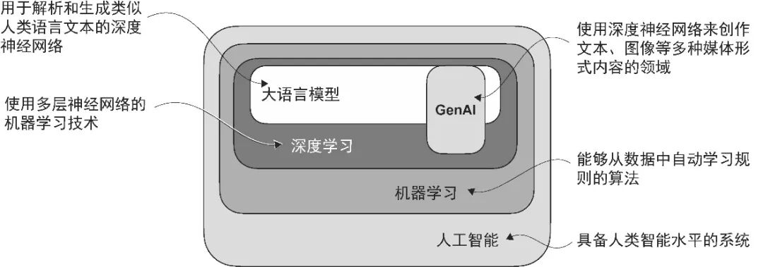 由于大语言模型能够生成文本,因此它们通常也被归类为生成式人工智能(generative artificial intelligence,简称 generative AI 或 GenAI)。如图 1-1 所示,人工智能是一个囊括机器学习、深度学习等众多分支的领域,旨在开发能够执行需要人类智能水平的任务(包括语言理解、模式识别、决策制定等)的机器。