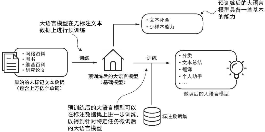 通过在无标注数据集上训练获得预训练的大语言模型后,我们可以在带标注的数据集上进一步训练这个模型,这一步称为微调。