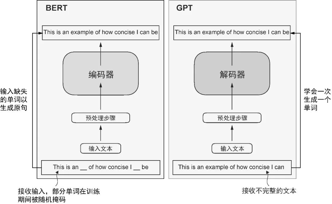 图 1-5 Transformer 编码器和解码器的可视化展示。左侧的编码器部分展示了专注于掩码预测的类 BERT 大语言模型,主要用于文本分类等任务。右侧的解码器部分展示了类 GPT 大语言模型,主要用于生成任务和生成文本序列