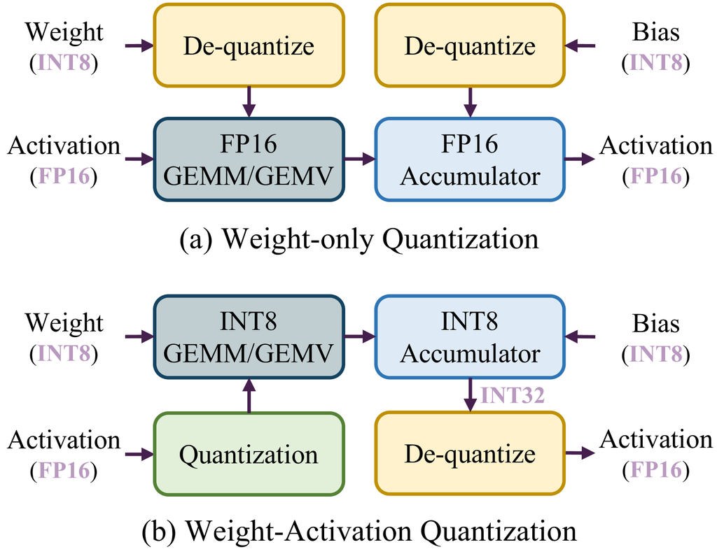 在解码阶段,LLM 在每个生成步骤仅处理一个标记,使用通用矩阵向量乘法 (GEMV) 作为核心运算。 解码阶段的延迟主要受大型权重张量加载的影响。 为了解决这一挑战,现有方法专注于仅量化权重以加速内存访问。而权重量化为: 首先对权重进行离线量化,然后将低精度权重反量化为FP16格式进行计算,如上图(a)所示。