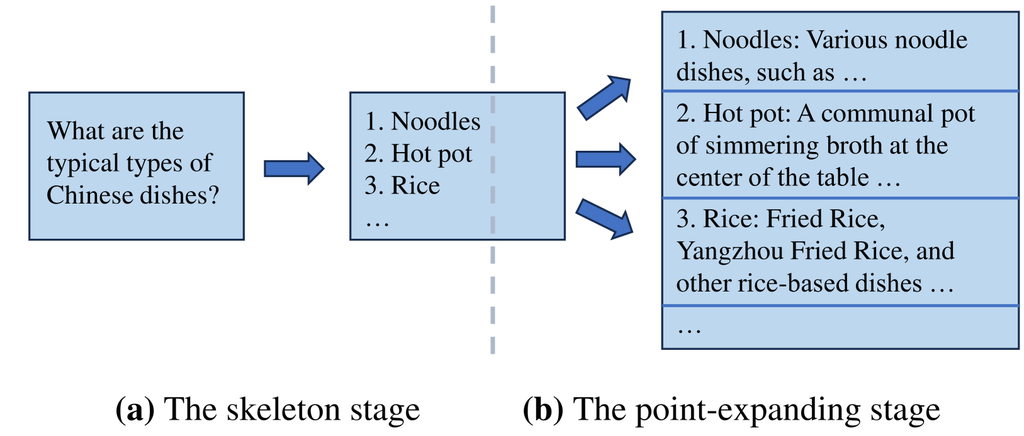 输出组织:是指在通过组织输出内容的结构来(部分)并行化生成。这里有一个例子:假设用户问:中国菜有哪些典型种类? 模型:第一阶段输出一个大致的内容列表,面条、火锅、米饭;模型:然后再根据面条、火锅、米饭进行扩展。