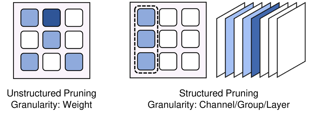 非结构化剪枝:以精细粒度剪枝单个权重值。 与结构化剪枝相比,它通常能在对模型预测影响最小的情况下实现更高的稀疏度。 然而,通过非结构化剪枝实现的稀疏模式缺乏高级规律性,导致内存访问和计算模式不规则。 这种不规则性会严重阻碍硬件加速的潜力,因为现代计算架构针对密集、规则的数据模式进行了优化。 因此,尽管实现了更高的稀疏度,非结构化剪枝在硬件效率和计算加速方面的实际优势可能有限。