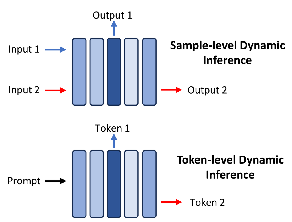 动态推理涉及在推理过程中根据输入数据自适应地选择模型子结构。 本节重点介绍早期退出技术,这些技术使大语言模型能够根据特定的样本或 token 在不同的模型层中停止推理。 值得注意的是,虽然 MoE 技术在推理过程中也会调整模型结构,但它们通常需要昂贵的预训练成本。 相比之下,早期退出技术只需要训练一个小型模块来决定何时结束推理。 退出技术研究分为两种主要类型:样本级早期退出和 token 级早期退出。